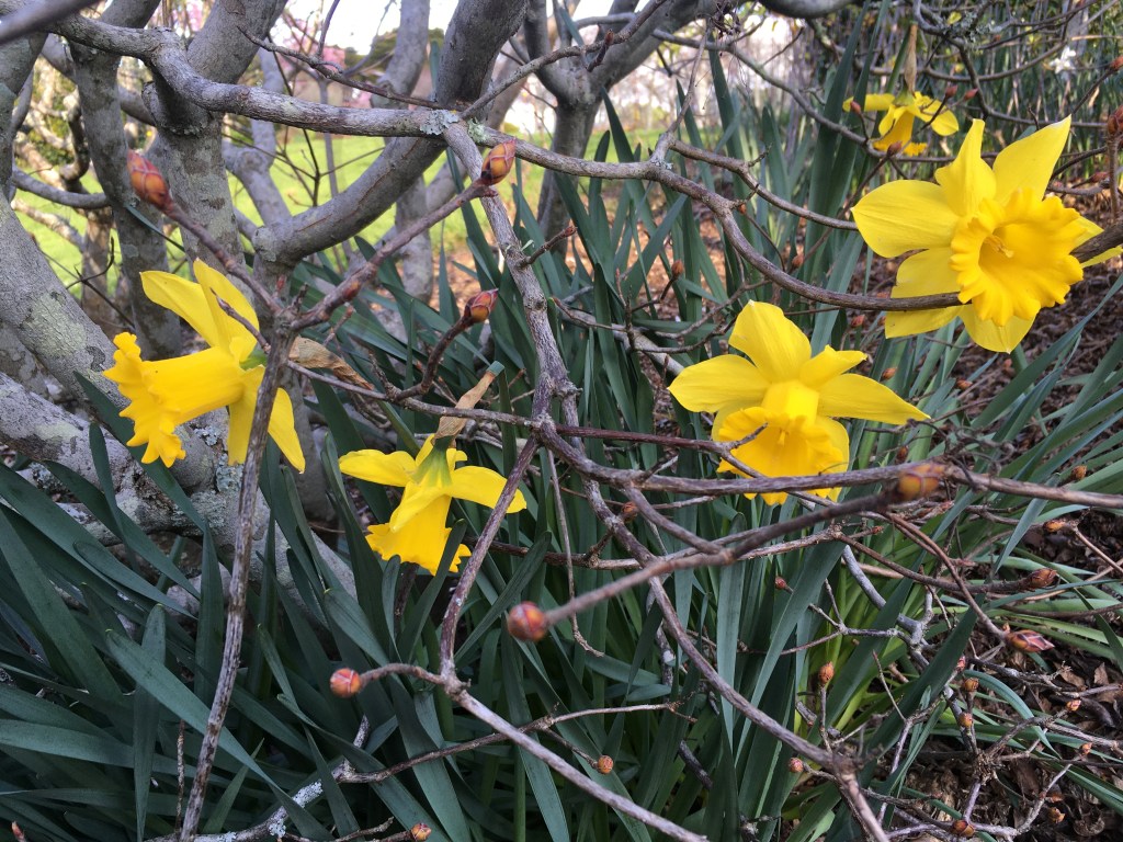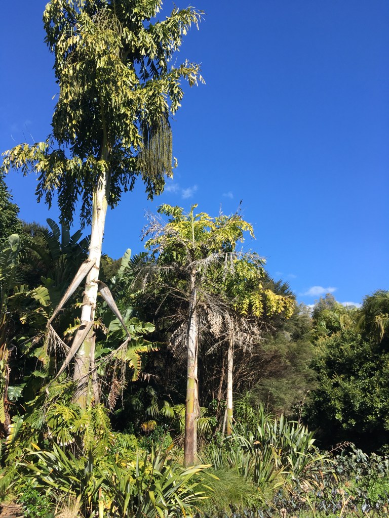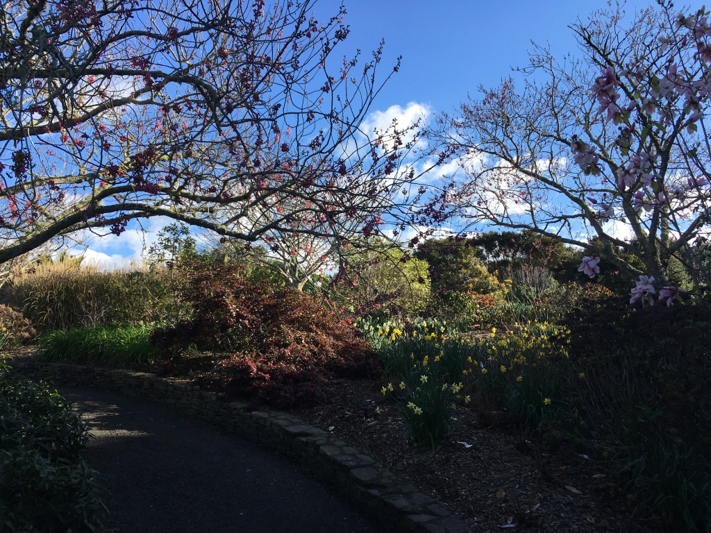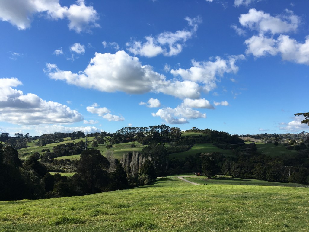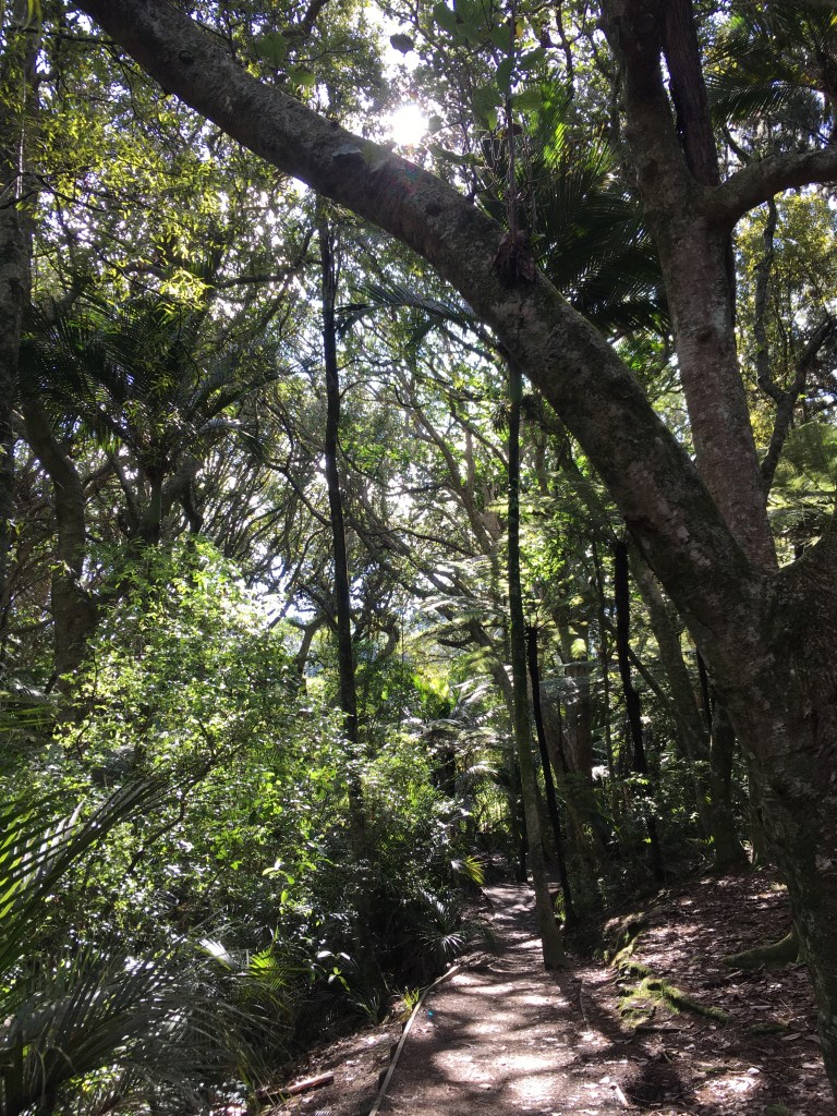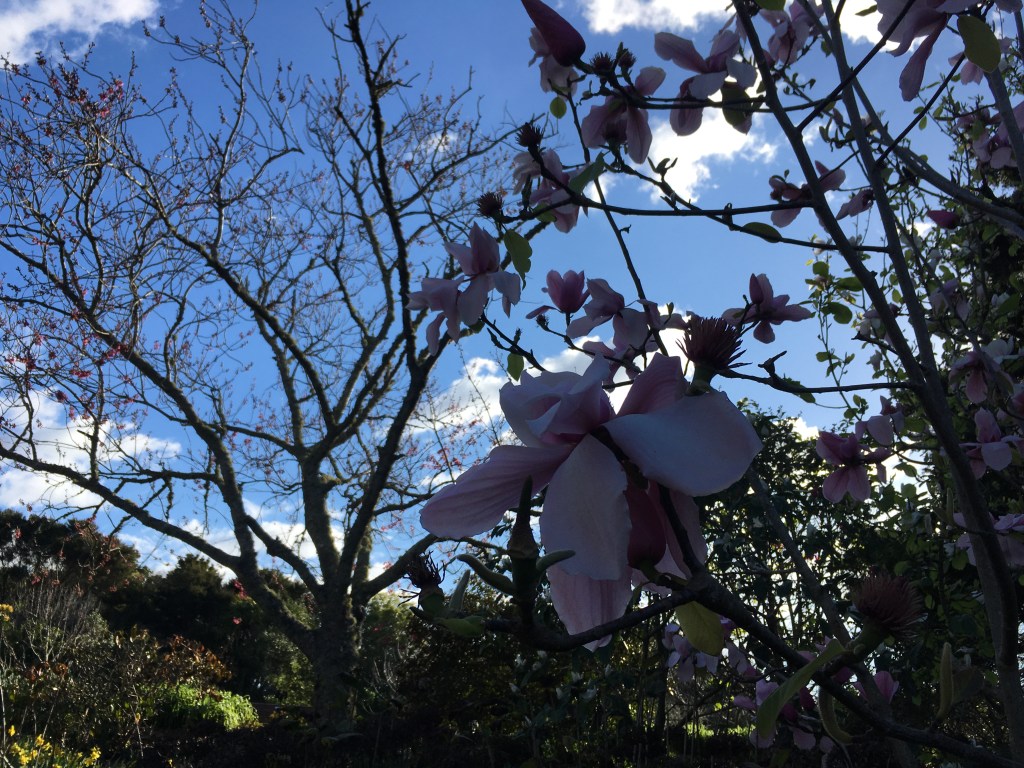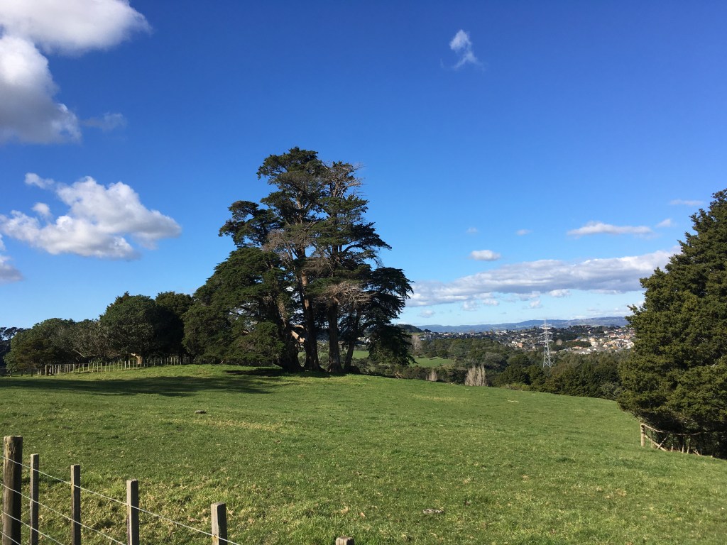 Like so many others, our plans for leave were dashed last week when Auckland went back into lockdown. So we stayed local. Four hours of walking outside in the sun, around thirteen kilometres of fresh air. We started up by the Visitor Centre, meandered happily through the Edible Garden, descended down into the Arboretum, picked up the Puhinui Stream Forest Trail, hopped over a style into Tootara park, paused to watch a squabble of brightly coloured parakeets, then climbed through fields of cows up onto the lookout, before dropping back amongst the trees and winding our way home through magnolias, camelias, and daffodils.
