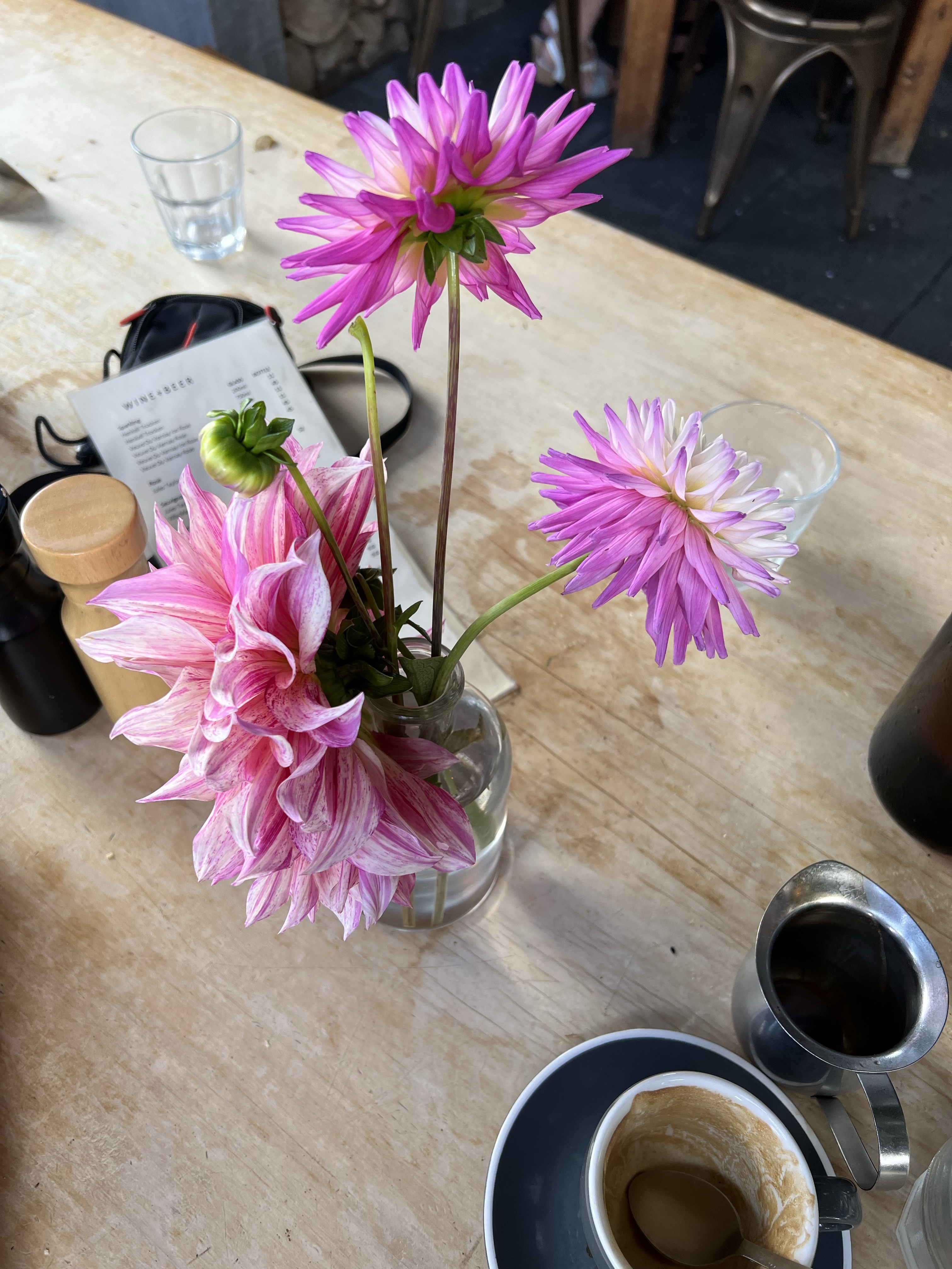 Just when it seems that O can take no more, we arrive at our first stop: The Lily Pad Cafe, in Cambridge. K has been wanting to take me there for years, but timings have never aligned. So I am enchanted too as we enter the gravel courtyard, with tables spilling out under a canopy of vines, bright bunches of dahlias, planter boxes overflowing with herbs. A high chair has been set up at our table, but O won’t sit there for long, preferring to be walked around the gardens, grabbing for leaves to munch upon. Time seems to stop while we’re there, we sit back and watch the elements put on a show: now it is sunny, now heavy rain beats down. Water streams off the outdoor umberellas, drips noisily onto the ground. People seated in the yard hesitate, then move in for shelter. Except for one: casting a glance at the sky, he shrugs and simply puts his baseball cap back on.