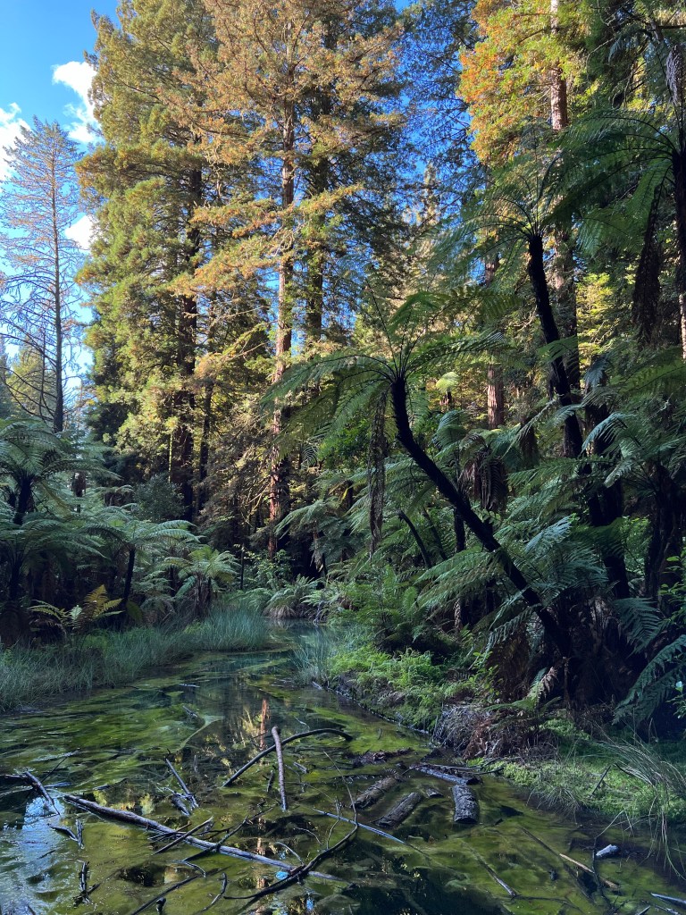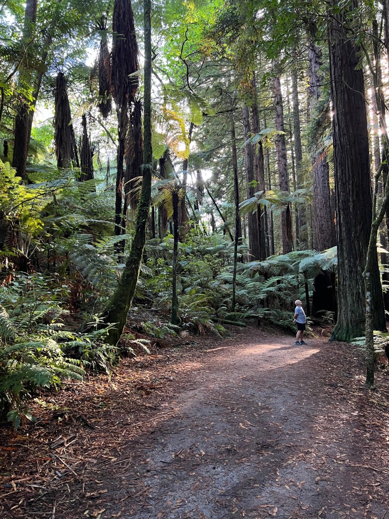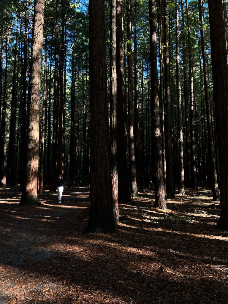 Rotorua is known for its geothermal activity, but by the time we arrive, most of the parks are closed. So we head to Kuirau, park up at the foot of the hospital, and stretch our legs around the eggy fumed frosted steam ponds. By now we’re hungry again, we raid a dairy for pies and ice cream, more cold drinks. And then away to the Redwoods, the peace of the forest.