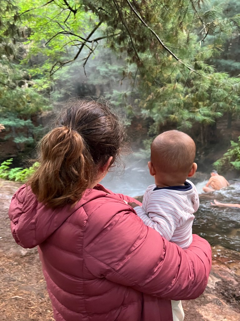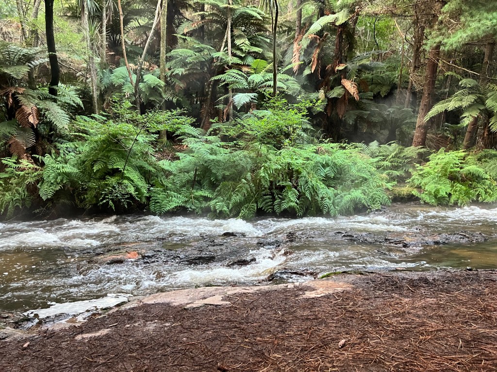 Finally, we load ourselves back in the car for one last stop. When I texted my family the night before, I told them to bring swimming gear. At every stop, my sister has asked if she should get changed. Now, finally, I tell her yes. The road out of Rotorua towards Kerosene Creek is a beautiful one, by now the sun is low and brilliant in the sky. We break off down a gravel path and see steam rising from the bush. When we finally arrive, it is more magical than I had dared imagine. Pushing past the small group of people close to the carpark, we make our way into a clearing. Clouds of steam rising from a rushing river. Astonishingly it is enough to entice even those who I never thought would swim. I sit in the roots of a great tree with O, their belongings strewn around me. He too is astonished, staring out at the swimmers, then back at me, puzzled but delighted, letting out shouts and cries of excitement.